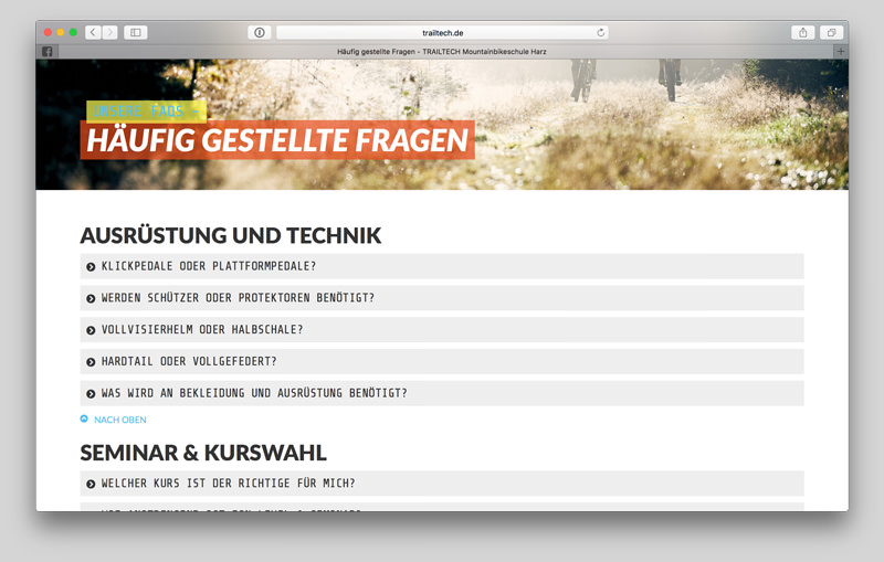 Für Trailtech – die Mountainbikeschule im Harz – durften wir die Webseite erneuern. Mit dem über die Jahre gewachsenen Corporate Design und den dynamischen und wunderschönen Bildern von Paul Masukowitz  (http://paul-masukowitz.de) konnten wir auf einer soliden Basis aufbauen. Neben einer kompletten Überarbeitung der Informationsarchitektur (z.B. filterbare Veranstaltungen nach Schwierigkeitsgrad, Ort oder Kondition) entwickelten wir ein Design, welches auf allen Devices den gleichen Komfort bietet. Zum Einsatz kamen ein Content Management System (Contao) und eine Katalog Extension, über die die Kurse, Workshops und Touren verwaltet werden.