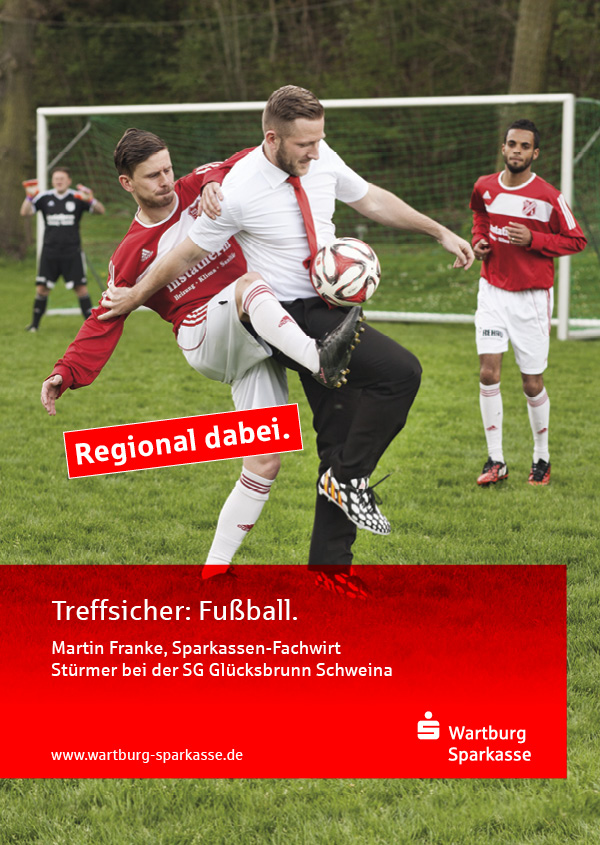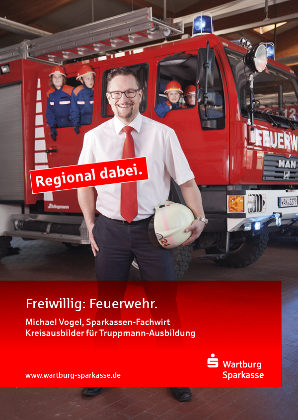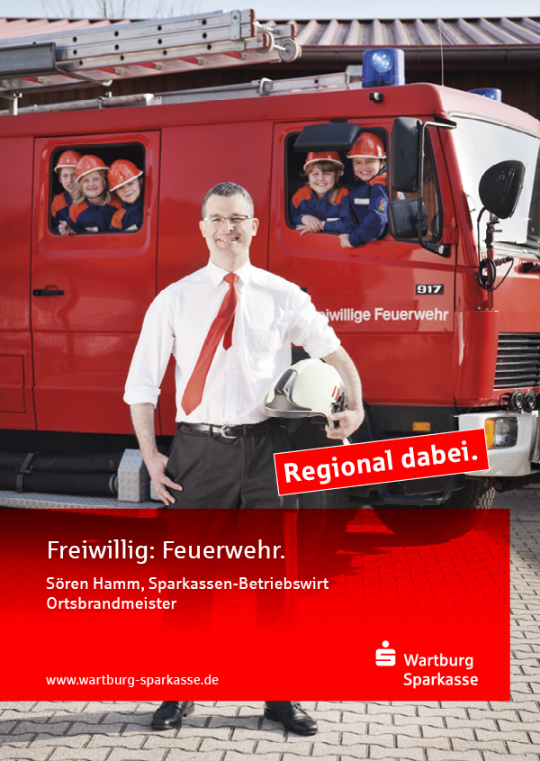 Die Wartburg-Sparkasse beauftragte uns mit der Planung und Umsetzung einer mehrmonatigen Imagekampagne. Dabei sollte die starke Verwurzelung in der Region eine Hauptrolle spielen. Deshalb setzte unser Konzept „Regional dabei.“ auf authentische Geschichten und Menschen, die direkt mit der Sparkasse in Verbindung stehen. Bei mehreren Fotoshootings wurden Mitarbeiter zu verschiedenen Themen in Szene gesetzt. Tagsüber Berater, nach Feierabend ehrenamtlicher Ausbilder bei der Freiwilligen Feuerwehr in der Rhön. Oder Torschützenkönig und mit dem Verein Aufsteiger in die Landesklasse. Handball, Fußball, starke regionale Unternehmen und junge Familien beim Hausbau – die Sparkasse ist vor Ort dabei. Neben der klassischen Filial-Plakatwerbung sorgten die Motive auch im Facebook-Auftritt der Sparkasse für Aufmerksamkeit.